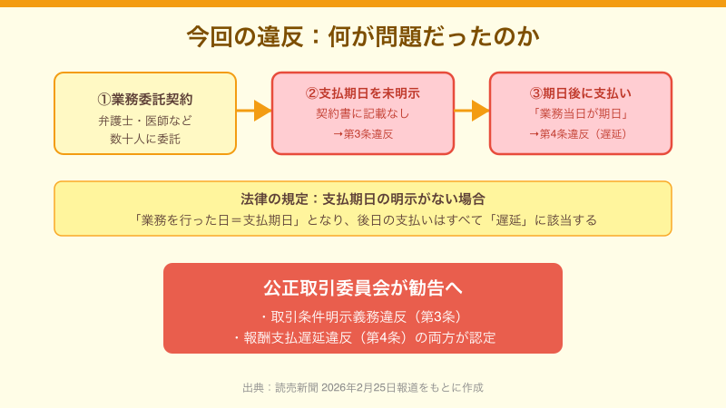 今回の違反の核心は、「士業の専門家への業務委託」という場面にあります。