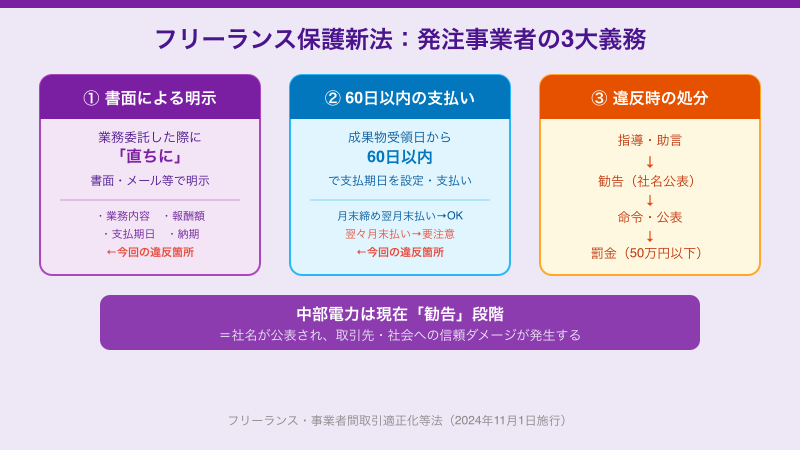 改めて確認しておきましょう。2024年11月1日に施行されたこの法律が発注事業者に課す主な義務は次の3点です。
