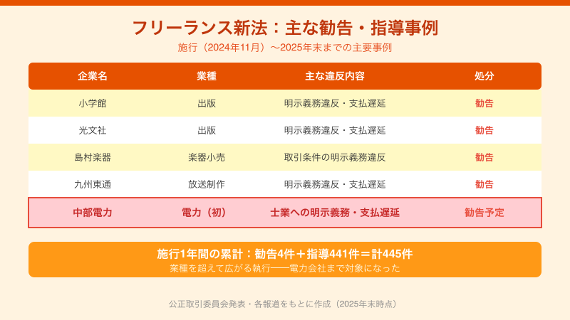 電力会社という、フリーランスとの取引が「多い業種」とは思われていなかった企業が勧告の対象になりました。これは、フリーランス保護新法が想定する射程がいかに広いかを示す、決定的な事例です。
