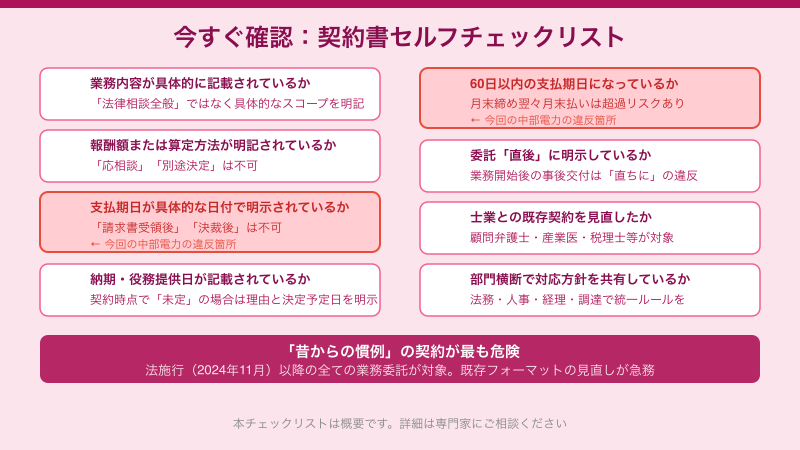 中部電力の事案が示すのは、コンプライアンス体制の整備された大企業であっても、「慣例に頼った契約管理」が続く限り、フリーランス保護新法の網から逃れられないという現実です。