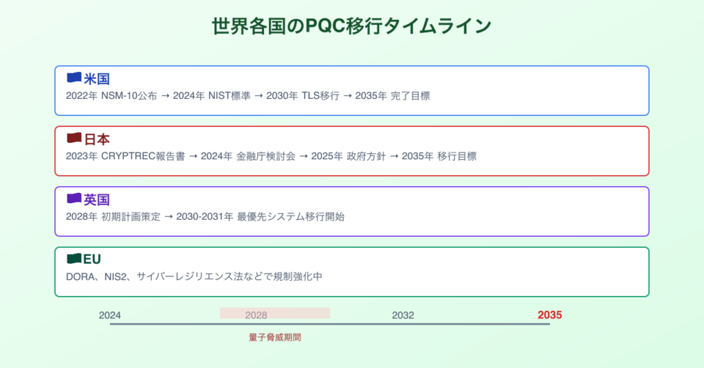 - 英国:NCSCが2028年までに初期計画策定、2030〜2031年に最優先システムの移行開始を推奨