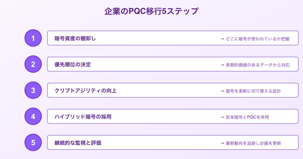 - ハイブリッド暗号(従来の暗号とPQCを組み合わせたもの)から完全なPQCへの段階的移行が必要