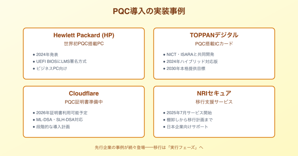 NRIセキュアテクノロジーズは2025年7月に「耐量子計算機暗号(PQC)への移行支援サービス」を開始するなど、民間でもサービス提供が始まっています。
