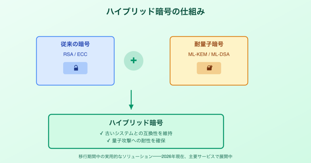 多くの組織は、移行期間中にハイブリッド暗号を採用します。これは従来の暗号(RSAやECCなど)とPQCを組み合わせる方式で、以下の利点があります: