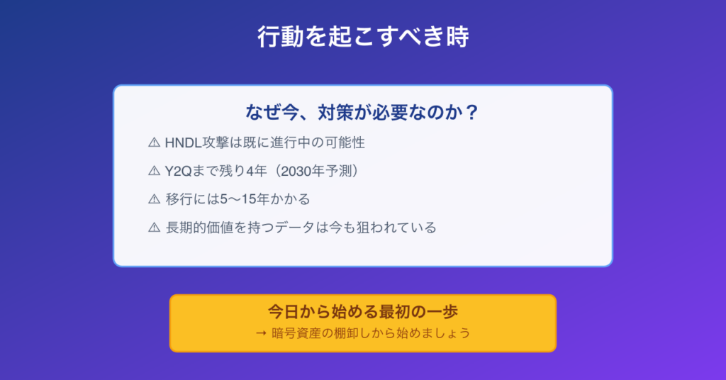 一部の組織は「量子コンピュータの脅威はまだ先の話」として対策を先延ばしにしています。しかしHNDL攻撃がすでに進行中である可能性を考えれば、これは危険な賭けです。